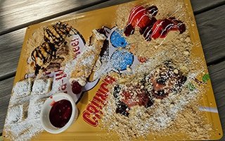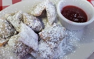 Dusted with powdered sugar and served with a strawberry sauce for dipping