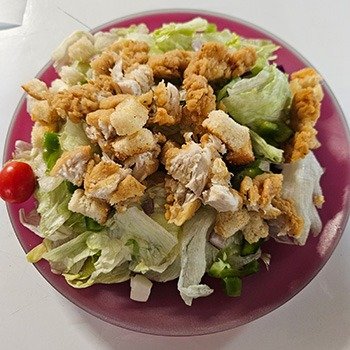 Iceberg lettuce, green pepper, red onion, croutons, and cherry tomato.